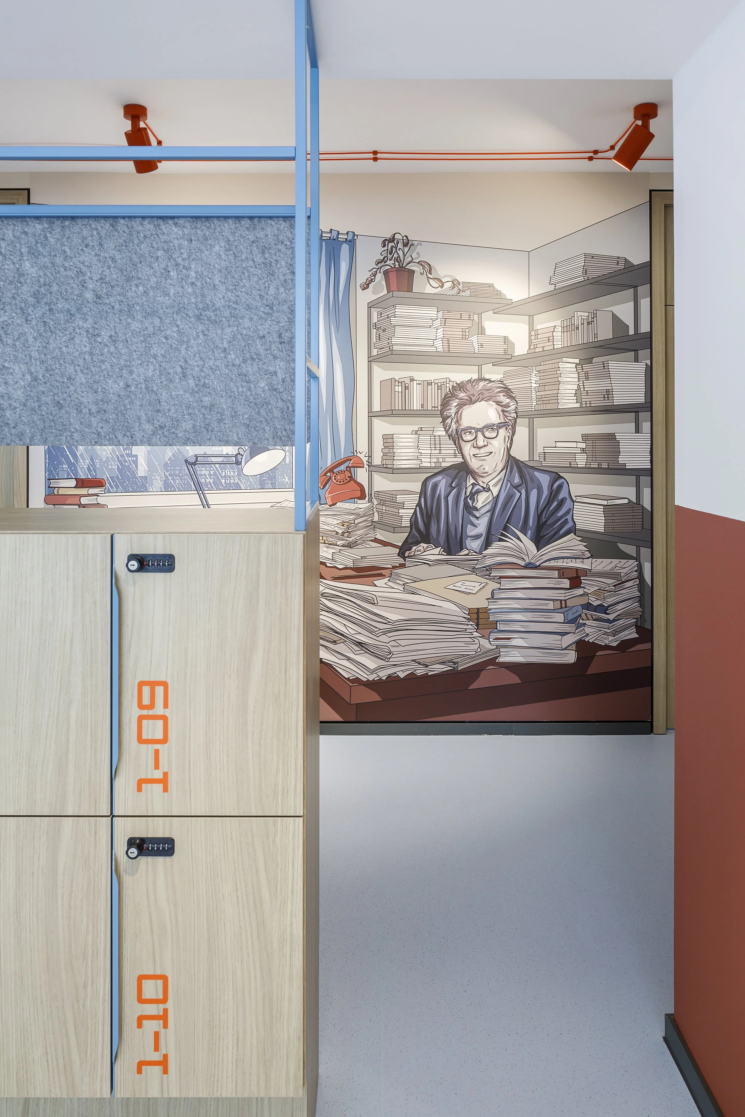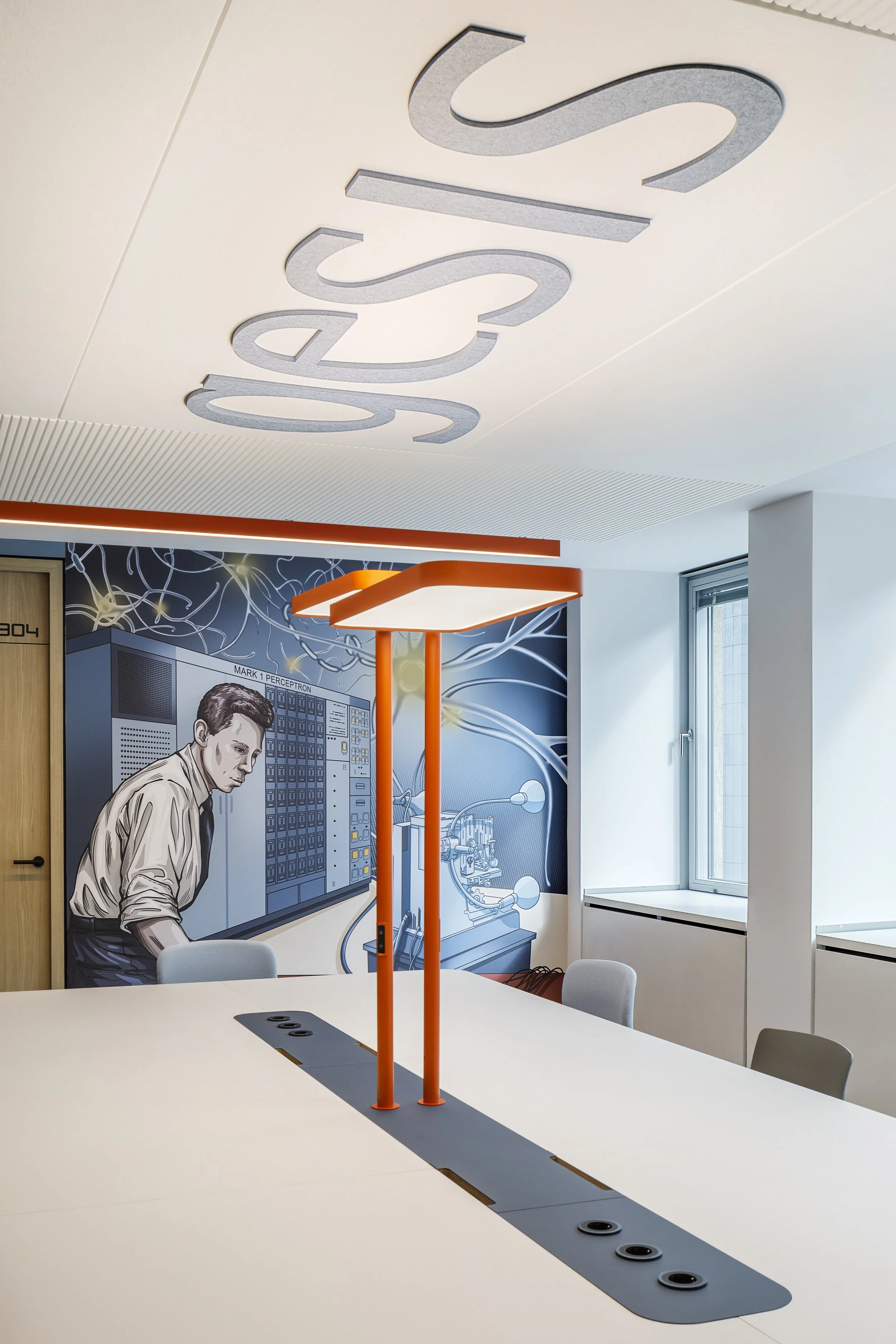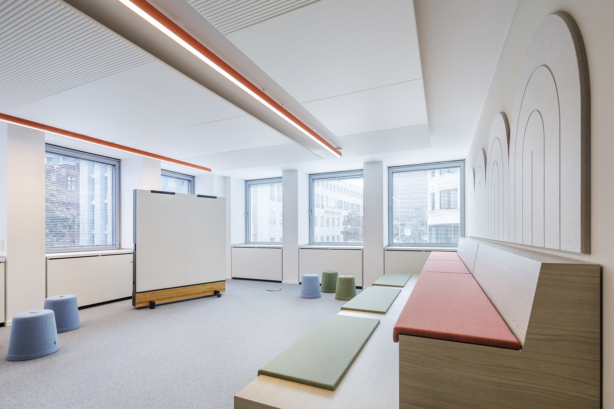 Das gezielt auf die neue Raumstruktur ausgearbeitete Farbkonzept greift die CI-Farben von GESIS auf und ergänzt sie auf jeder Etage um prägnante Akzentfarbe, die die Orientierung erleichtern und die Atmosphäre der jeweiligen Zonen unterstützen. So strahlen die offenen Community-Bereiche lebendige Farbwelten aus, die entspannen und zugleich anregen, während die Rückzugsorte bewusst dezenter gehalten sind. Um die Raumakustik in den offenen Zonen sinnvoll zu verbessern, integrierten wir individuell angepasste Akustikpaneele, sowie akustisch wirksame Vorhänge und Leuchten, die sich nahtlos in das Raum- und Akustikkonzept einfügen.