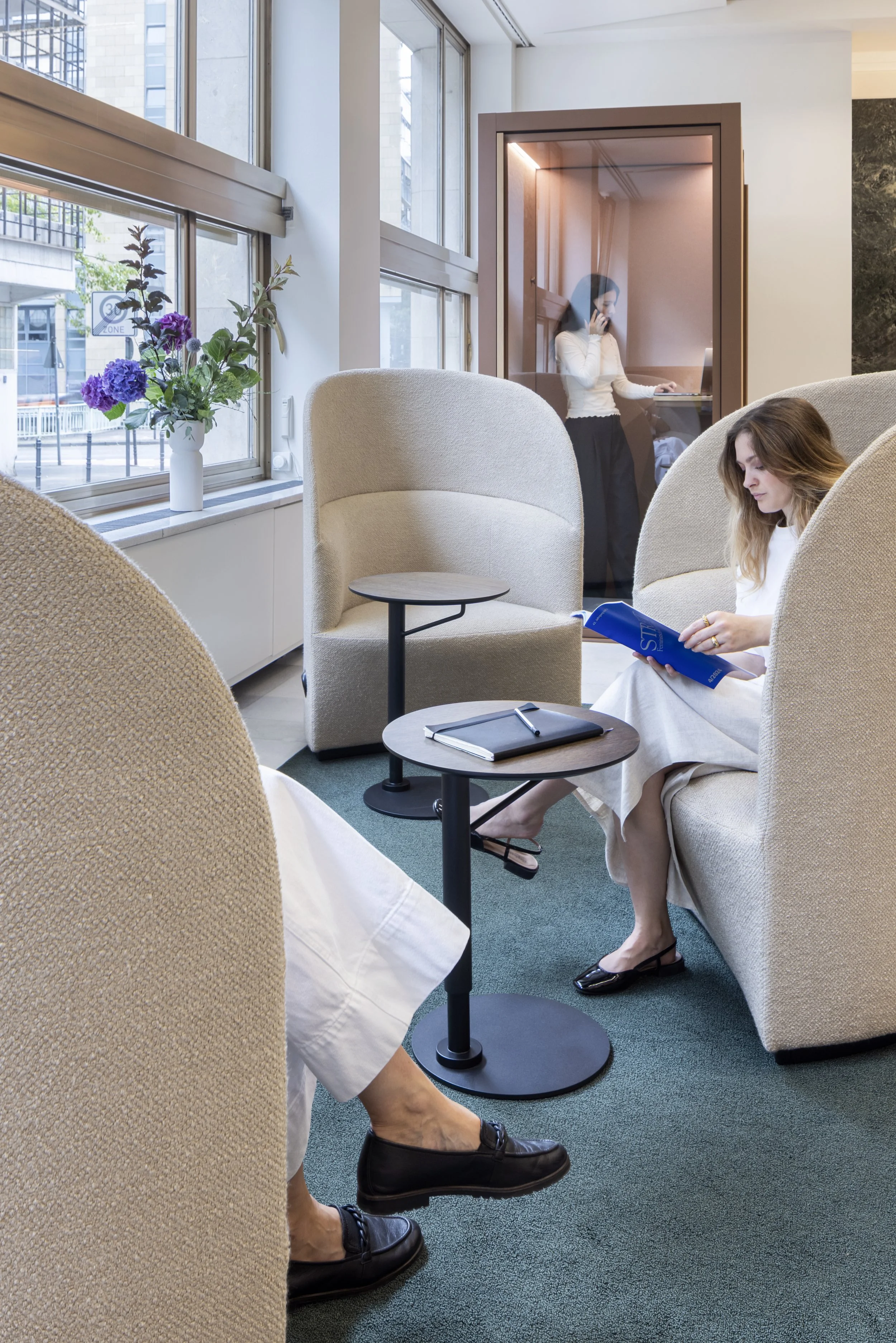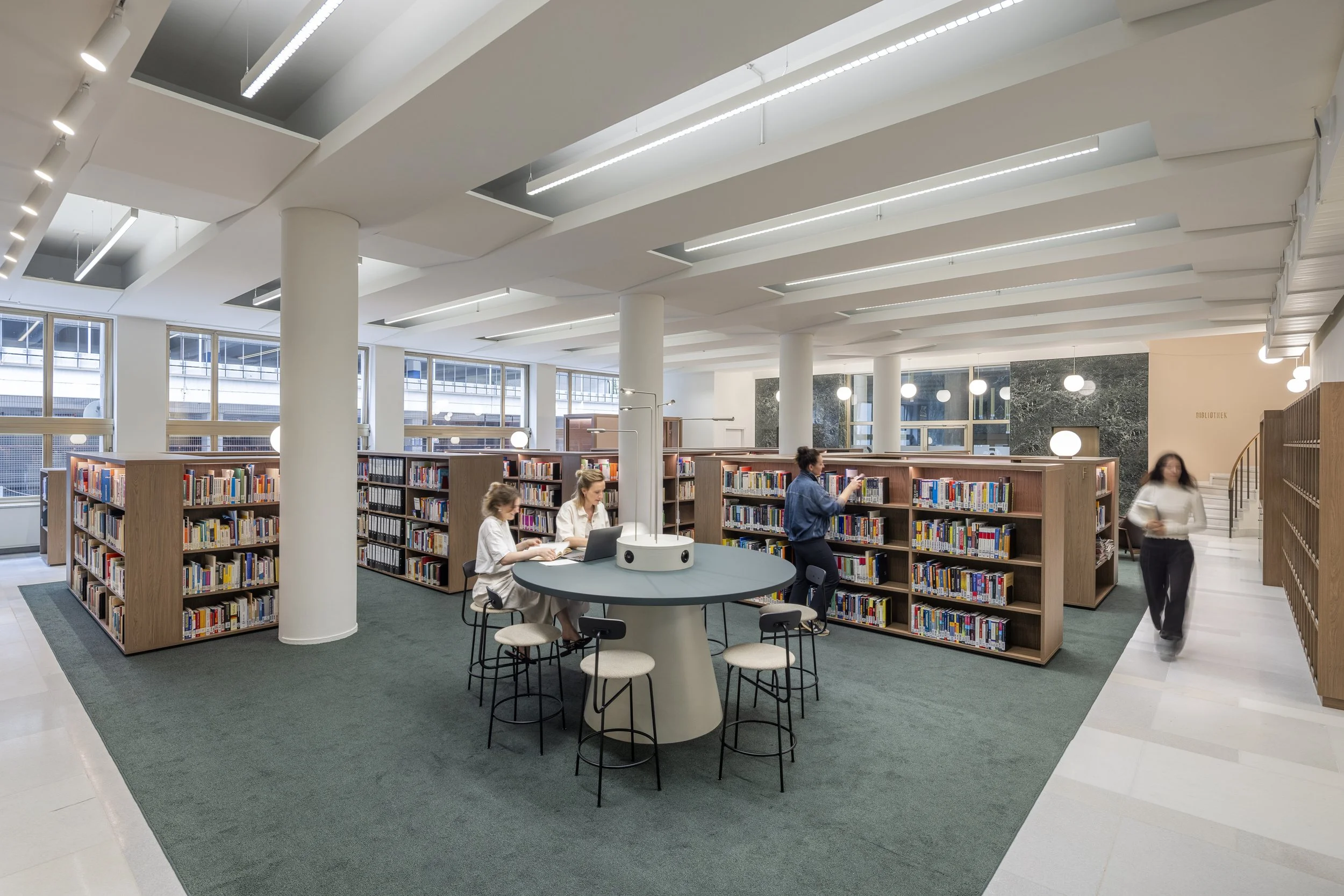 Offene Arbeitszonen, differenzierte Rückzugsbereiche und neue Kommunikationsorte fördern den informellen Austausch ebenso wie fokussiertes Arbeiten. Die klare Gestaltungssprache schafft Orientierung und unterstützt das agile Arbeiten jenseits starrer Raumstrukturen. Die zuvor abgeschlossenen Flure wurden geöffnet, Brandschutztüren weitestgehend geöffnet und mit ausgewählten Farben und Teppichen neu in Szene gesetzt.